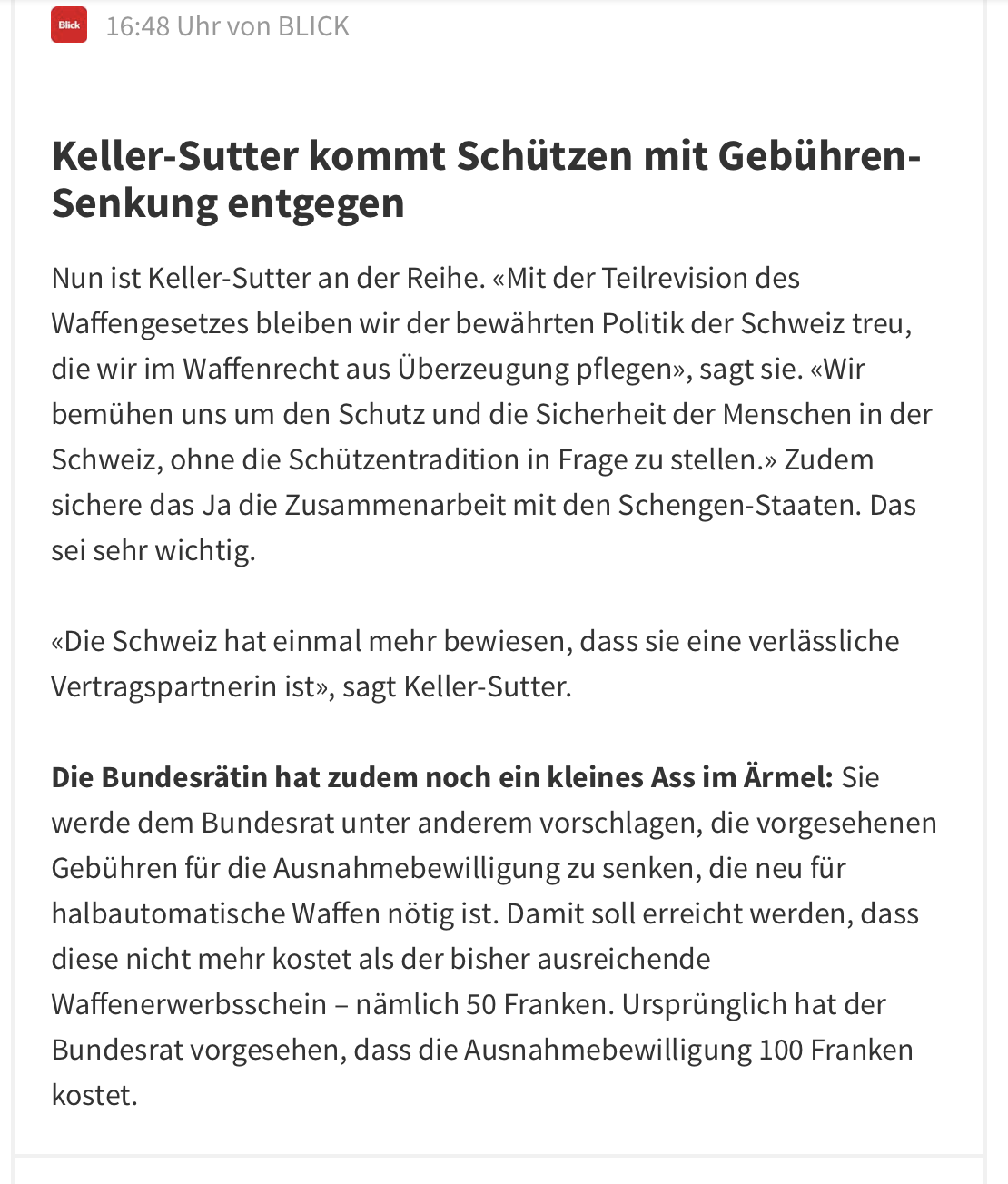 Klickt auf das Bild und lest selber was Frau Keller-Suter nun will, nur Fr. 50.-- statt Fr. 100.-- pro Ausnahmebewilligung??? Nur ein Vorschlag welcher noch nicht mal sicher ist.